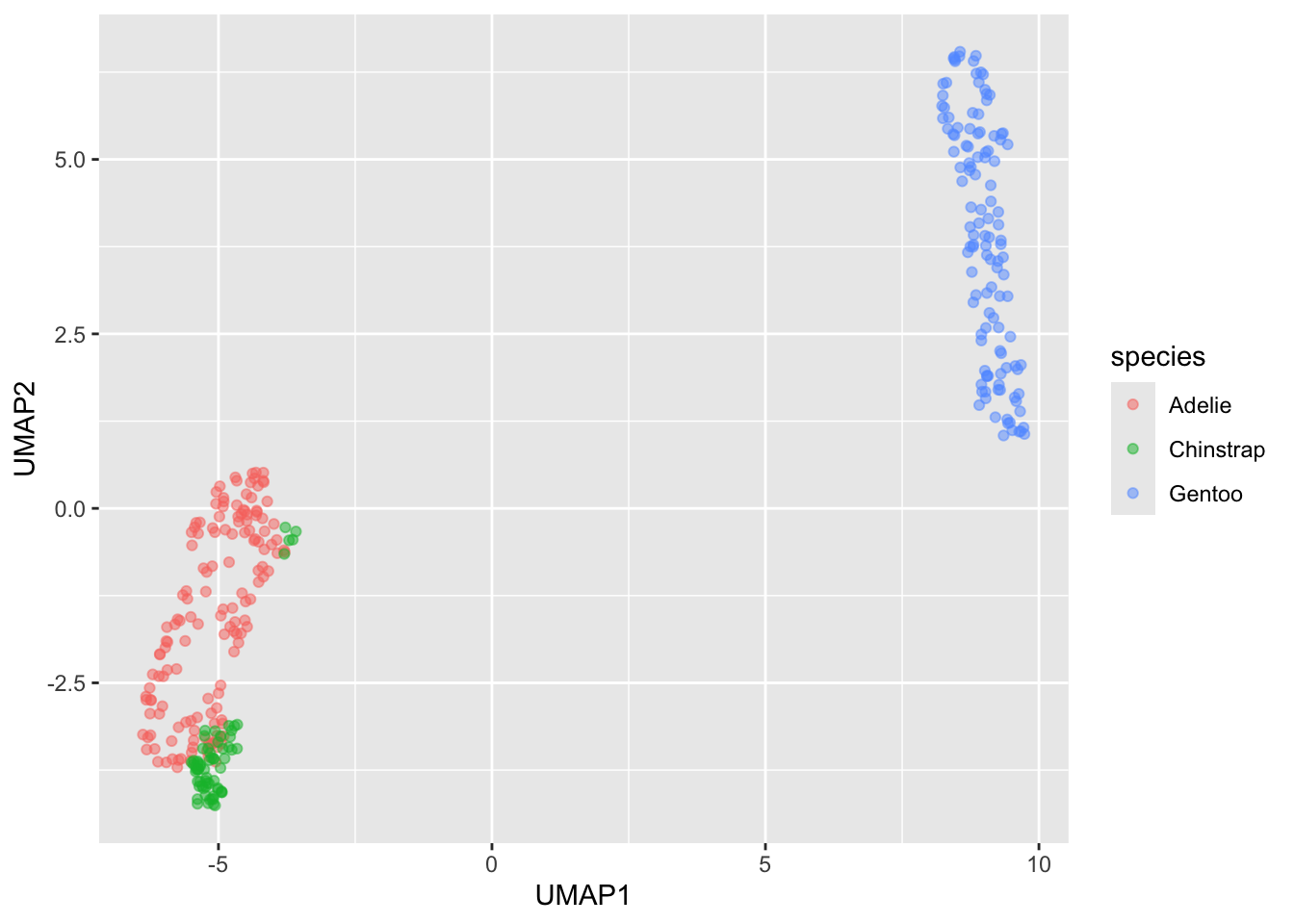 penguin_bake |> ggplot(aes(x = UMAP1, y = UMAP2, color = species)) +