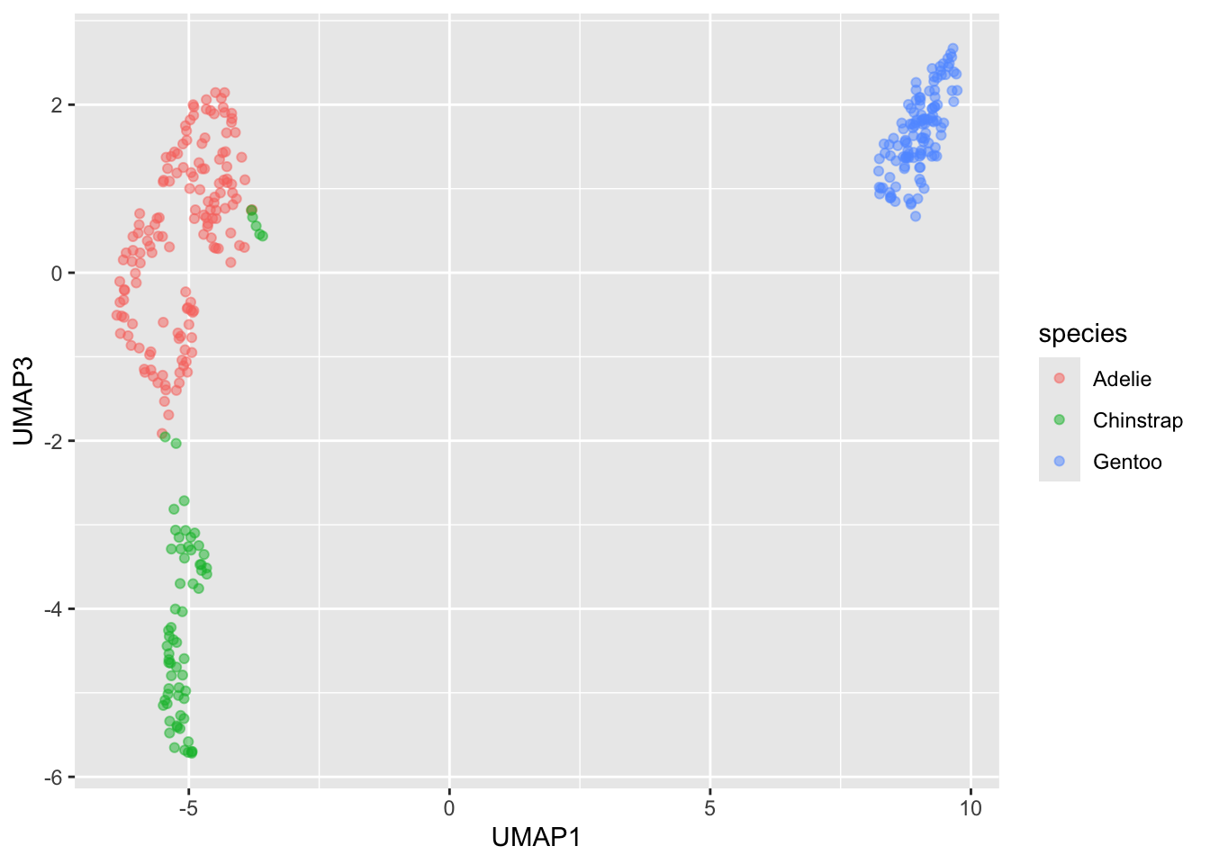 penguin_bake |> ggplot(aes(x = UMAP1, y = UMAP3, color = species)) +