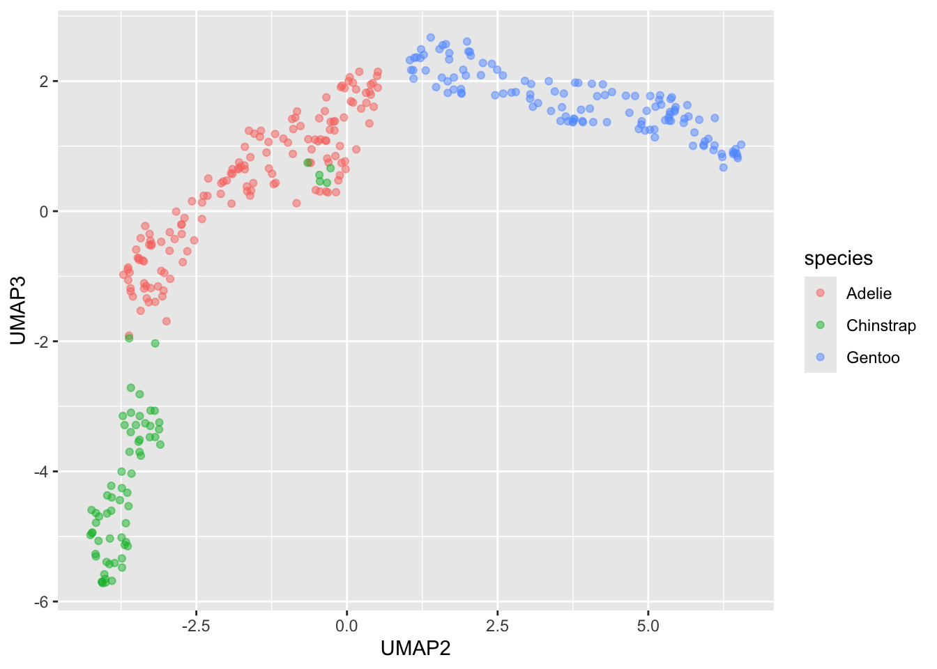penguin_bake |> ggplot(aes(x = UMAP2, y = UMAP3, color = species)) +