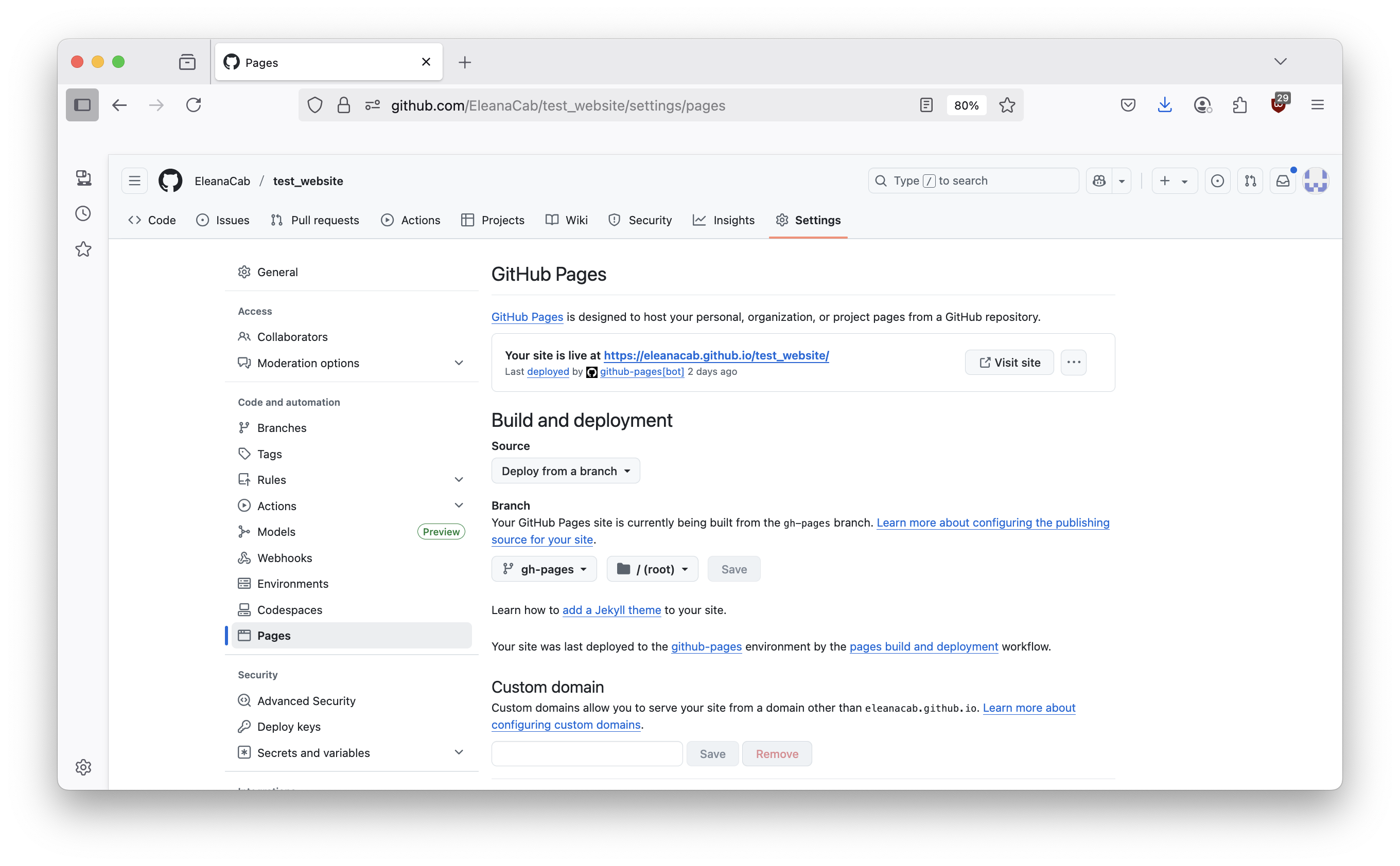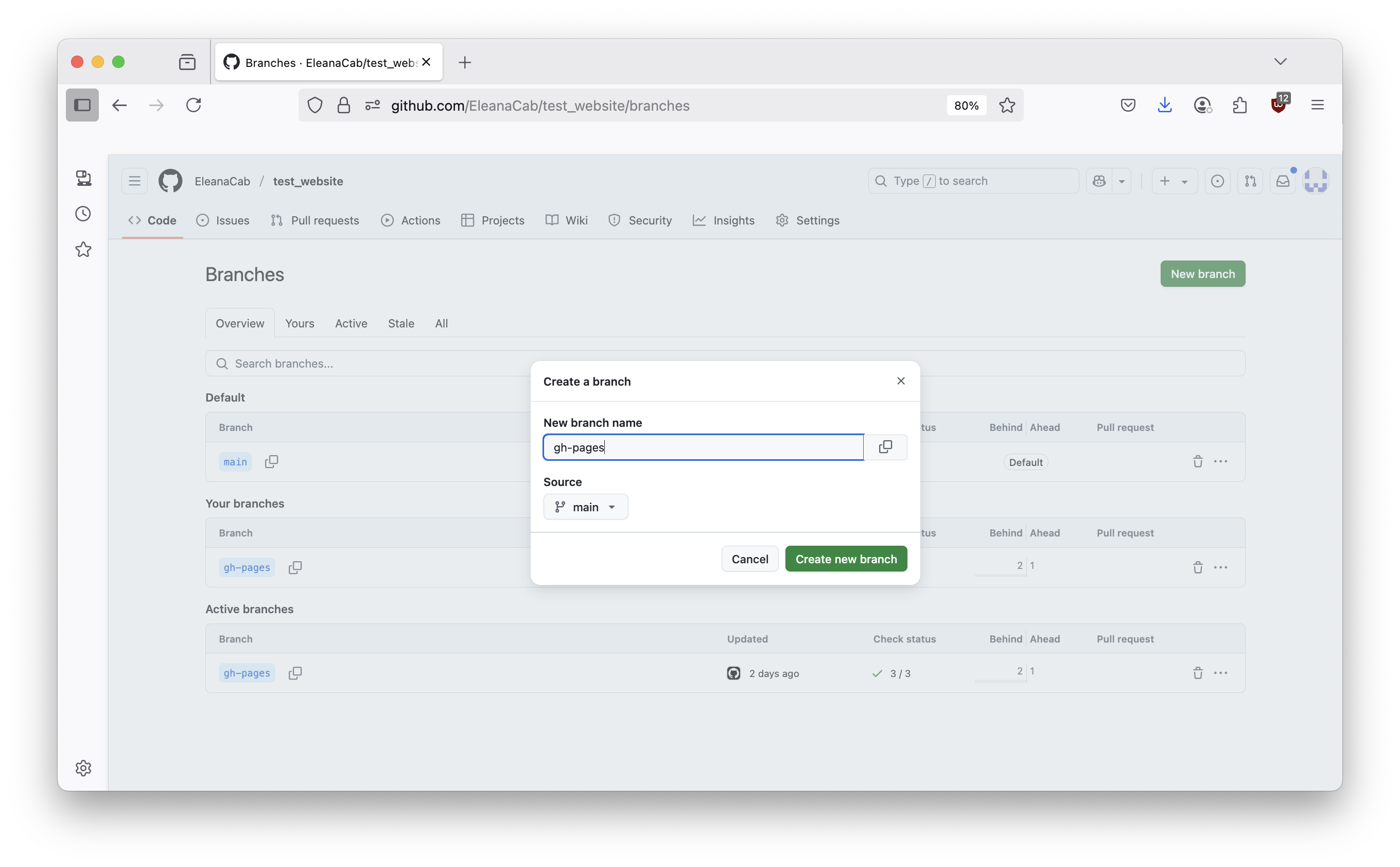 Make sure to name it gh-pages, it has to be named this in order for your website to work.