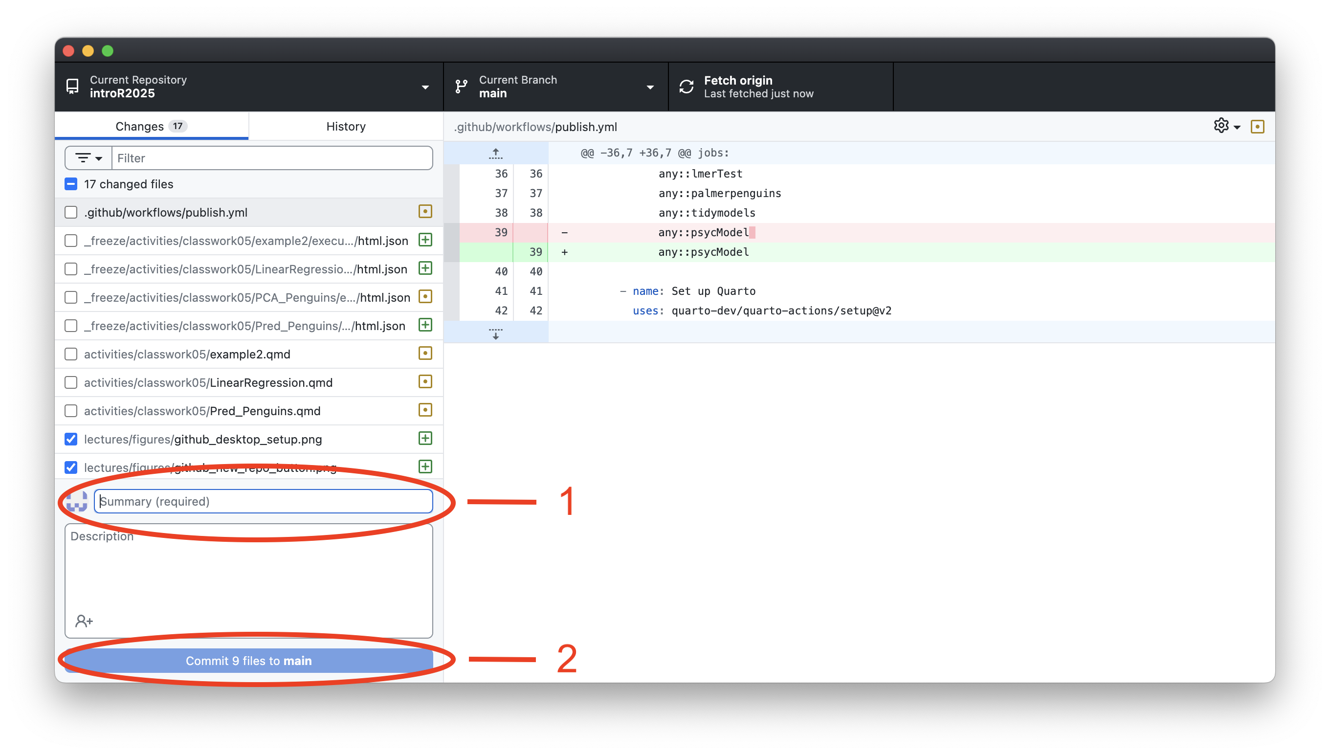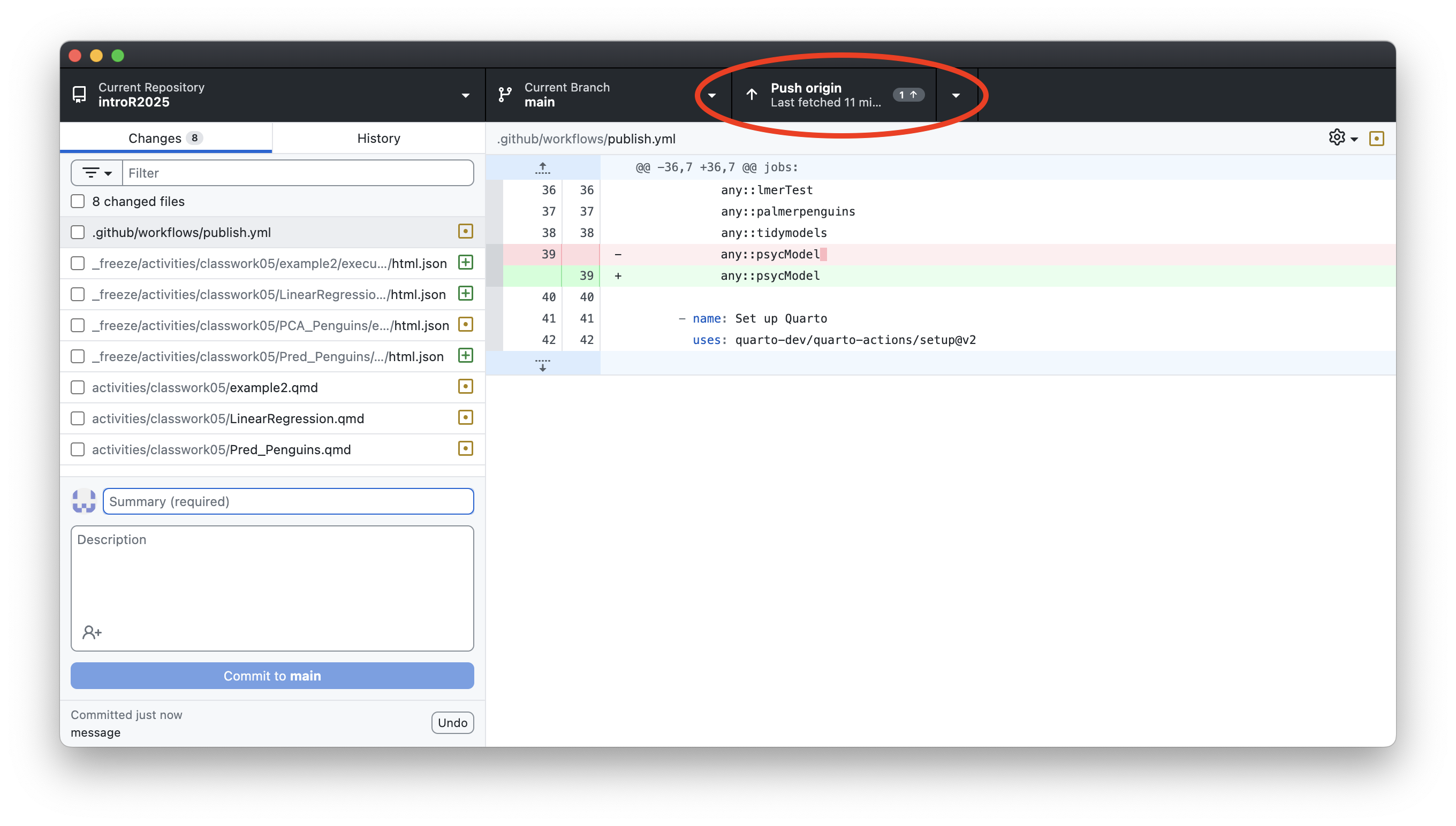In Github desktop type a commit message and commit to main.