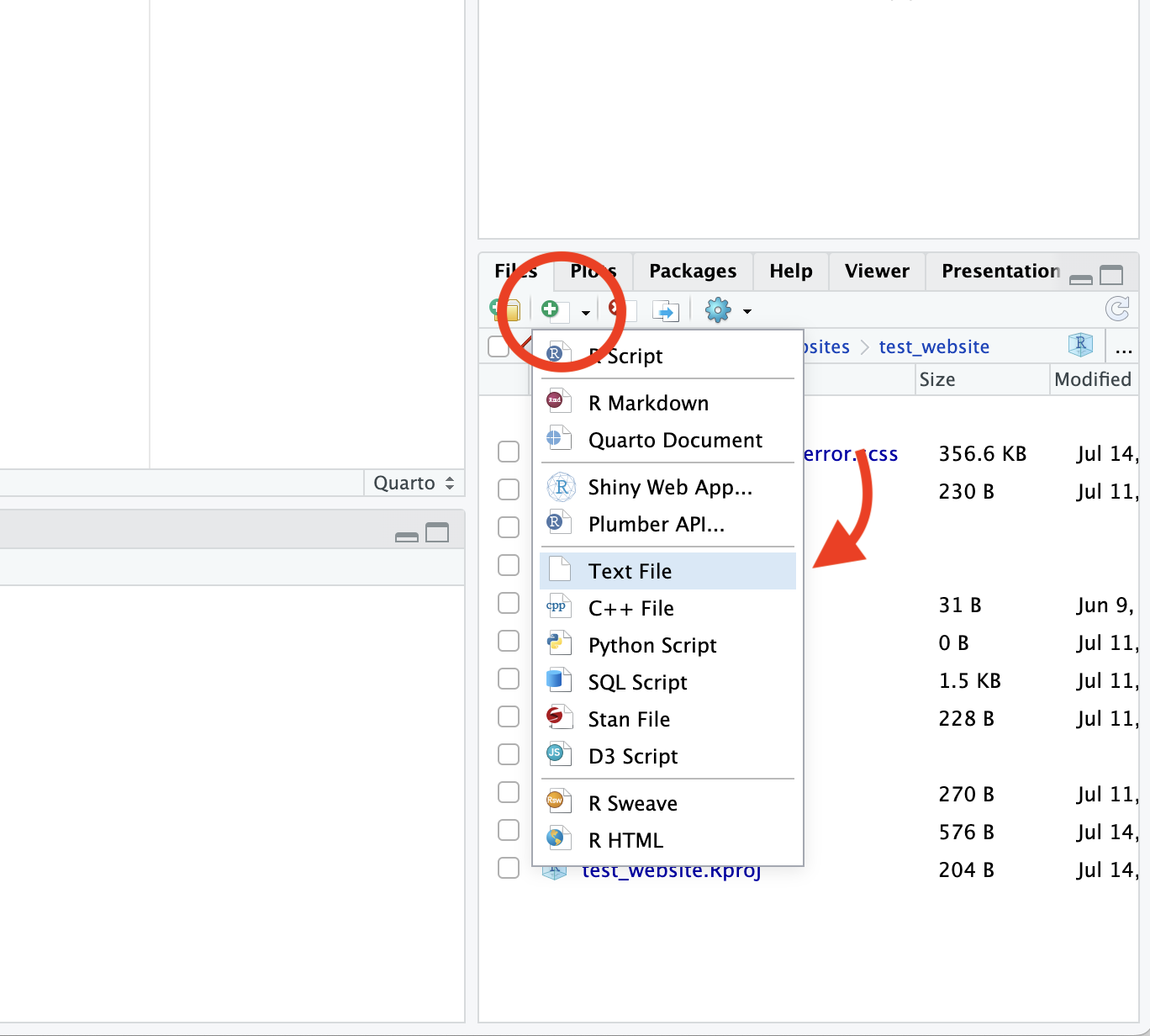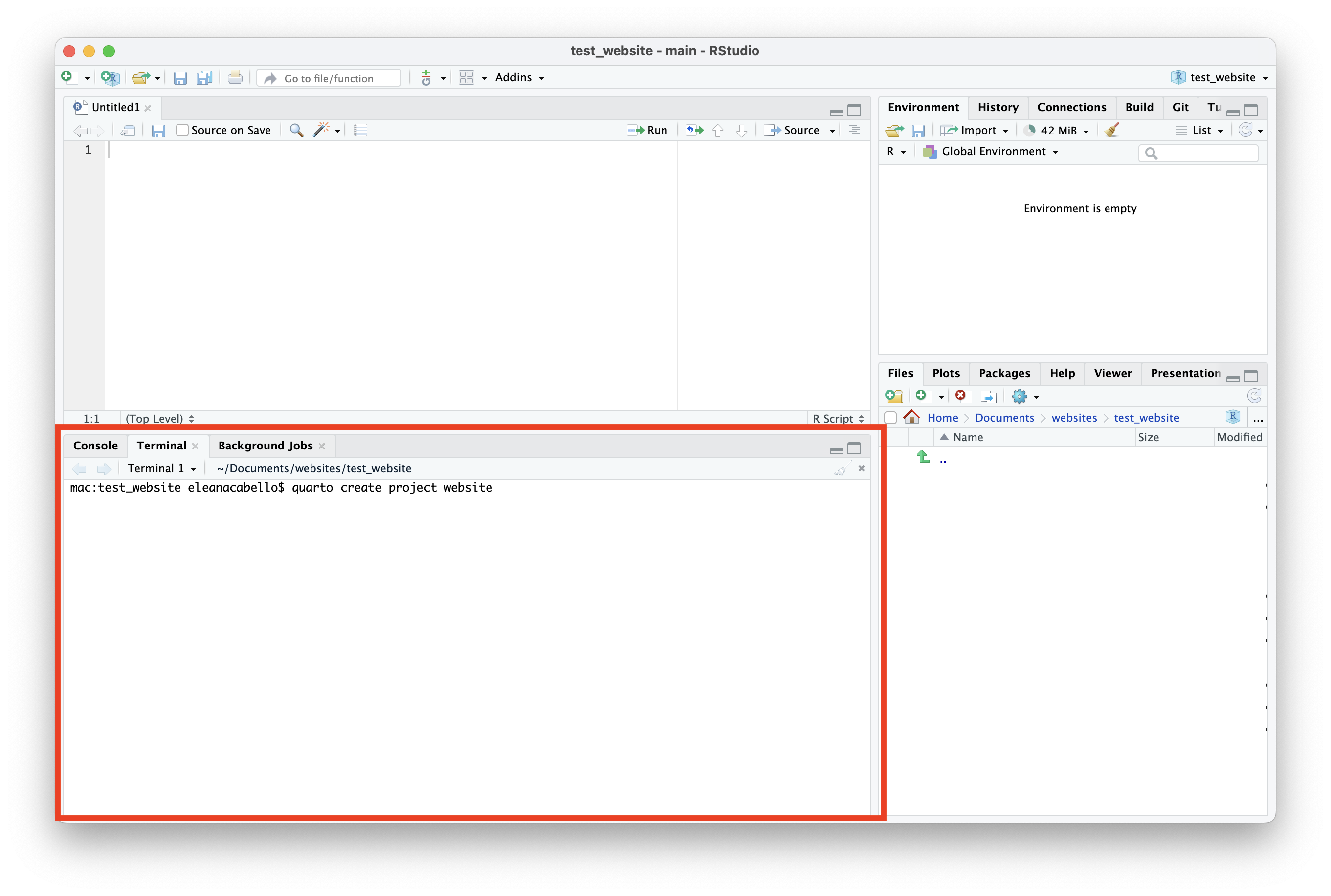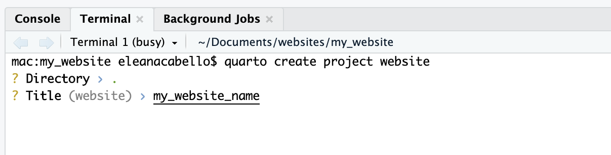 Type the following command in the terminal to create an RProject and setup a quarto website, a new window of RStudio will appear:
