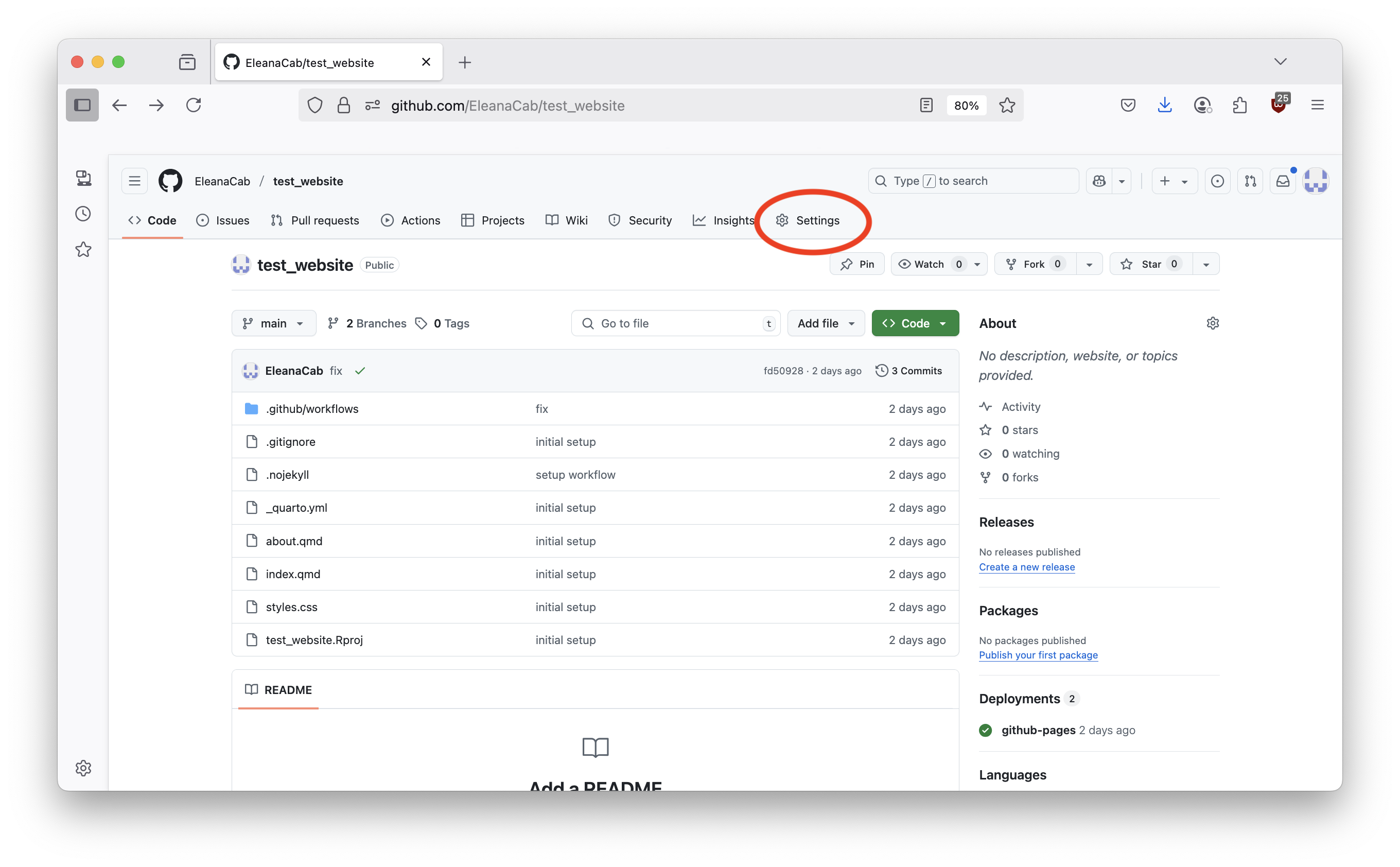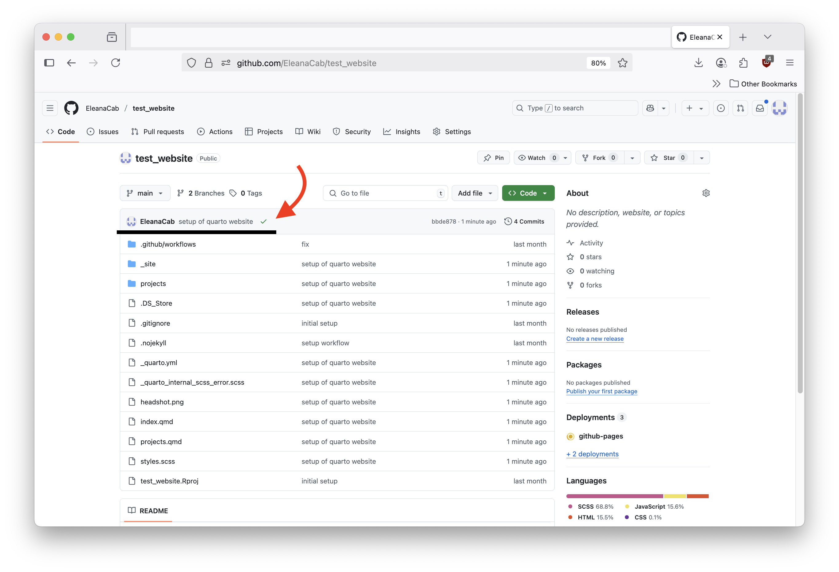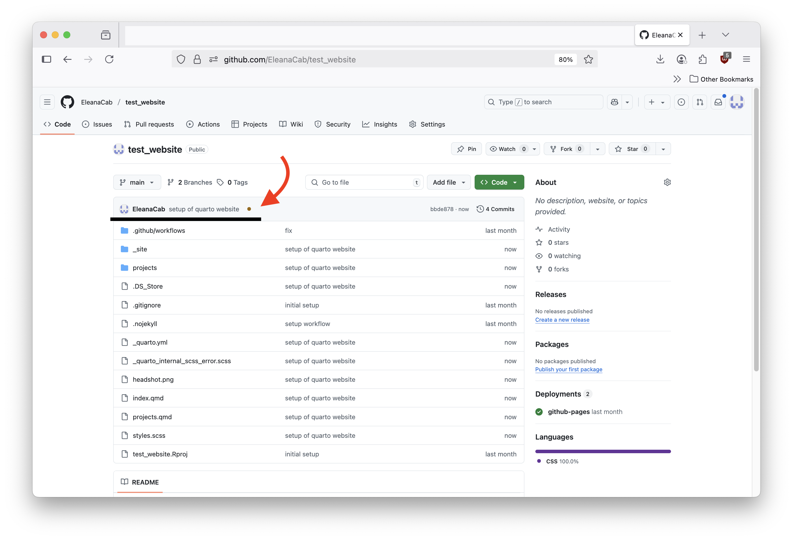 Type the following command in the terminal to create an RProject and setup a quarto website, a new window of RStudio will appear: