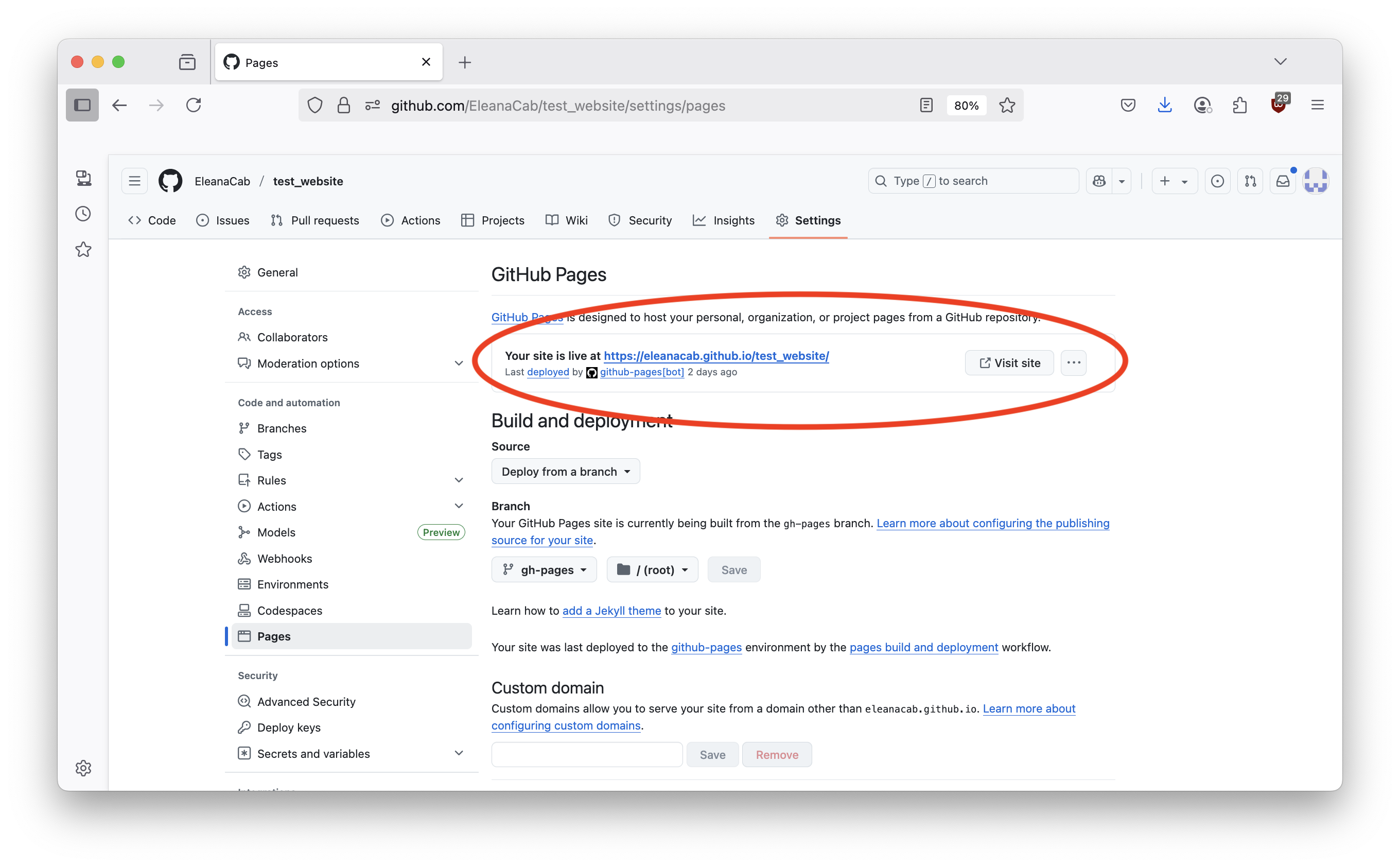 In pages make sure that under Build and Deployment Source is Deploy from Branch. Also make sure that under Branch that gh-pages is selected from /(root) like below: